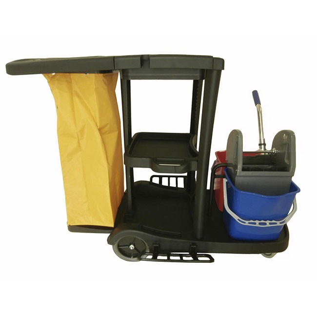 Carro de LIMPIEZA multiusos completo con cubo doble con prensa y saco.Dimensiones :Largo : 129 cms.Ancho : 81 cms.Alto : 98 cms.Contiene dos cubos de 17 litros, una prensa con labios, 3 bandejas porta objetos fijas y porta sacos con tapadera y saco de 70 litros plastificado con cremallera.Ruedas giratorias delanteras y fijas traseras.
